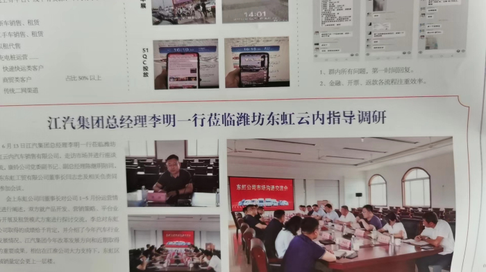 6月13日江汽集團(tuán)總經(jīng)理李明一行蒞臨濰坊東虹云內(nèi)汽車銷售有限公司,走訪市場并進(jìn)行座談交流,康鈴公司黨委副書記、副總經(jīng)理陳繼明陪同,山東東虹云內(nèi)汽車銷售有限公司董事長閆志忠及及相關(guān)負(fù)責(zé)同志參加會(huì)談。