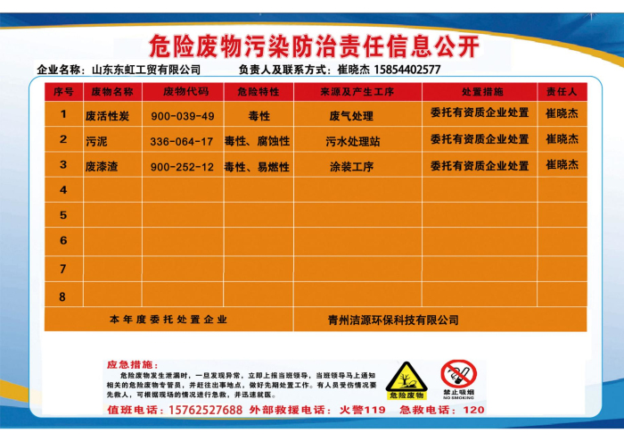 山東東虹工貿有限公司現就危險廢物污染防治責任信息公開如下:
